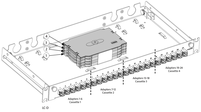 Патч-панель для під'єднання 48 вол.. LAN1 з 24xLC Duplex Adapt., OM3/OM4, 1U, висувна, чорний, Corning
